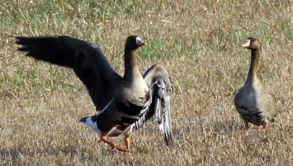 翼傷めたマガンに仲間が寄り添う 鳥取・米子水鳥公園