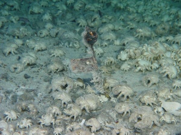 熱水噴出の5カ月後に集まってきたゴエモンコシオリエビ=海洋研究開発機構提供