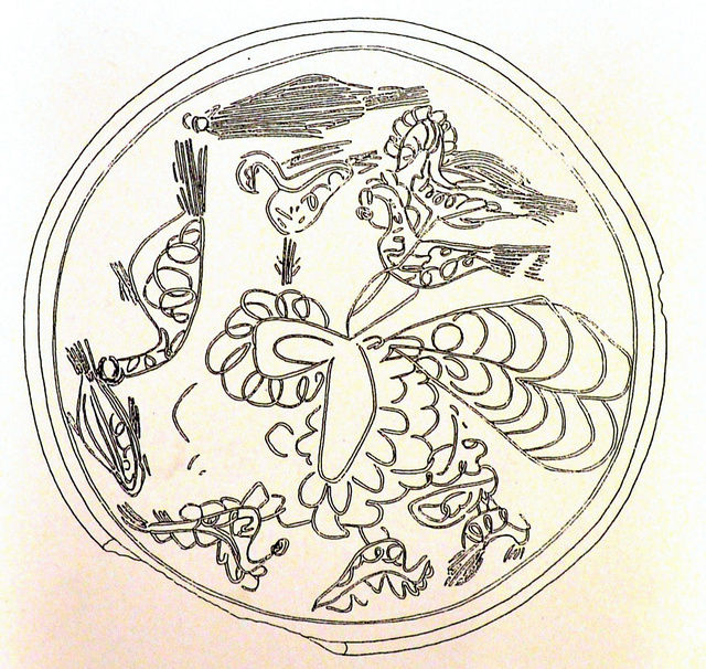 さらに土器の右端には影のような文様が描かれている。同博物館が考古資料における鳥の造形を専門的に研究している考古学者の賀来孝代(かく・たかよ)氏とともに分析した結果、鵜が水中を泳ぐ姿を水面の上から見た形とみられ、異時同図である可能性が高まった。異時同図の画法例としては奈良県・法隆寺の玉虫厨子(たまむしずし)「捨身飼虎図(しゃしんしこず)」があるが、鵜に関する異時同図は極めて珍しい。暗文絵画土器では鳥、草、花などを組み合わせて描くことはある。動きがある鵜の連続表現とすると、新発見となる。