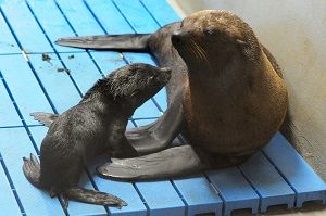 画像:母親(右)から生まれた赤ちゃんオットセイ(京都水族館提供)